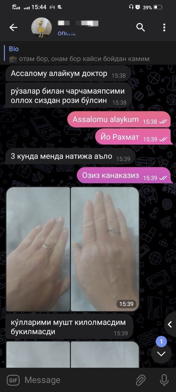 Синглимни ноумид қилмай деб у олиб келган воситани олиб қолдим. Кечаси қўлларимга суриб ётдим. Эрталаб кўрқувдан карахт эдим. Қўлимдаги псориаз деярли йўк эди. Қичишлардан эса асар хам қолмаган эди. Хурсандчилигимдан ойна қаршисида еғлар эдим.