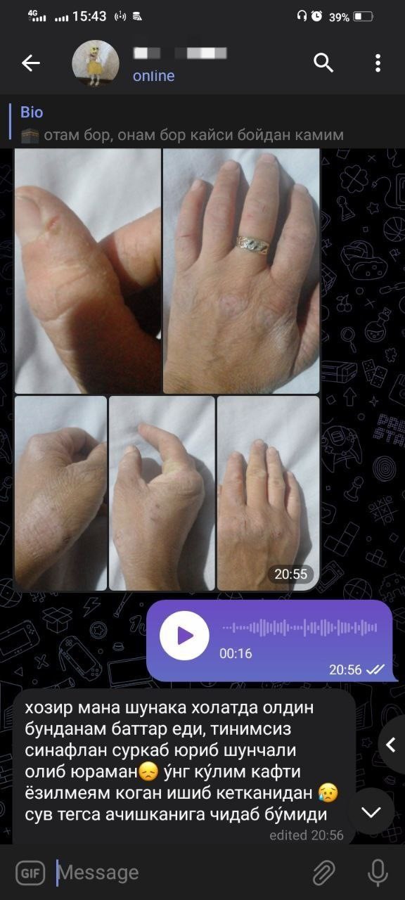Кийимларимни кийганимда худди қум тўкилгандек терим уқаланиб тушар эди. Киймим ишқаланганида псориаз жойлари қонаб кетар эди.Бу жуда дахшатли-а? Кўпинча, кариндошларимни тўйларига боришга ҳам уялар эдим.