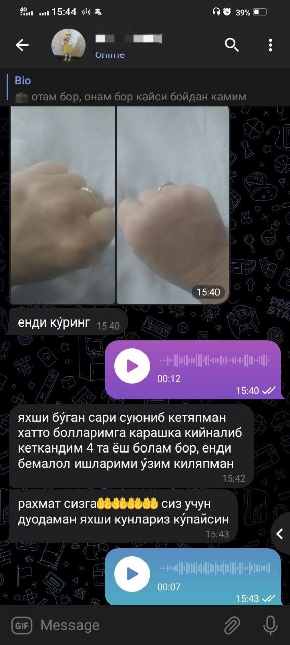 Ниҳоят мени бахтиёр қилган кун келди. Шу куни синглим мени уйимга келди. У мени тузалишимни жуда ҳоҳлар эди. У интернетдан қидириб, оша “мўжизани” мен учун буюртма берибди. Ажойиб-а?